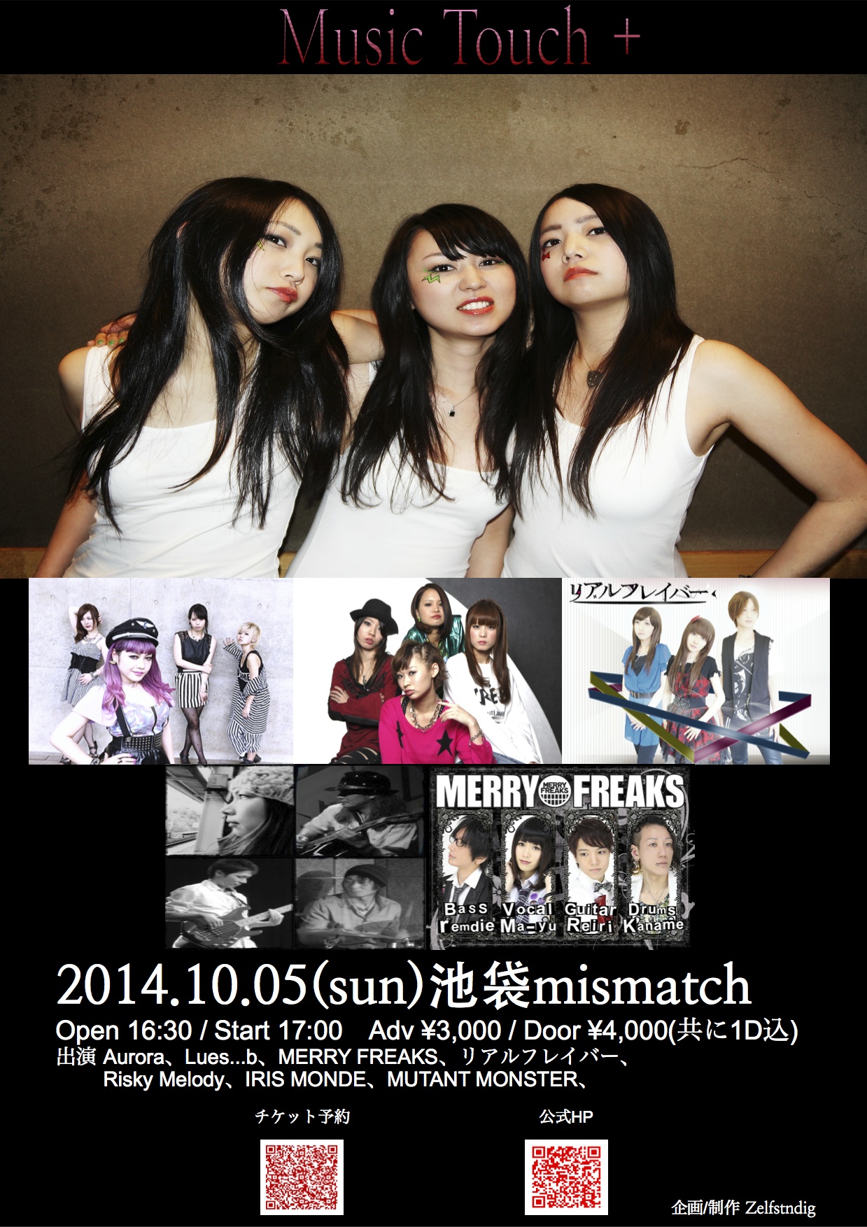 2014年10月5日(日) 【イベントタイトル】 『Music Touch +』 “2014Autumn / Girls BAND Night” 【会場】 mismatch@池袋 【時間】 OPEN 16:30 START 17:00 CLOSE 22:30 【料金】 予約・前売 3000円 当日 4000円(1drink代込み) 【出演者】 MUTANT MONSTER / リアルフレイバー / MERRY FREAKS / IRIS MONDE/ Risky Melody / Lues...b / Aurora |
