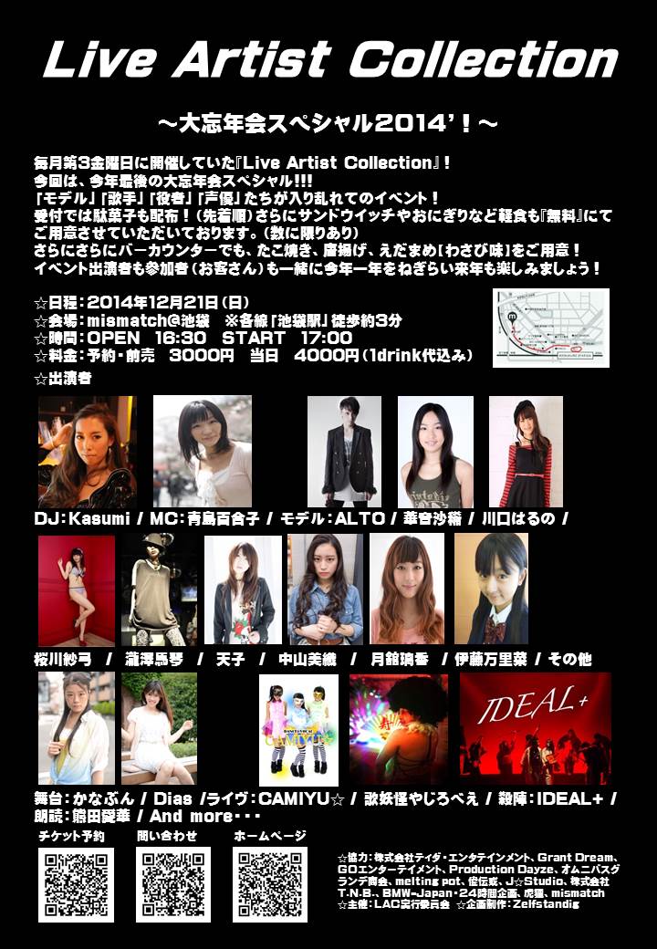 2014年12月21日(日) 【イベントタイトル】 『Live Artist Collection』 ~年末大交流会2014'!!!~ ~「TOKYO DESIGN FESTIVAL」(モデルショー)&「FAT」(舞台)&「LAC」(エンターテインメント)のコラボイベント~ 【会場】 mismatch@池袋 【時間】 OPEN 16:30 START 17:00 CLOSE 21:30 【料金】 予約・前売 3000円(1drink代込み) 当日 4000円(1drink代込み) 【モデルショー出演者】 ALTO / 川口はるの / 伊藤万里菜 / Nao / 月舘璃香 / 中山美織 / 華音沙稀 / 天子 / 桜川紗弓 / 瀧澤馬琴 / And more 【舞台】 Dias / かなぶん 【ライヴ】 CAMIYU☆ / 歌妖怪やじろべえ 【朗読】 熊田愛華 【殺陣】 花鳥風月 / IDEAL+ 【MC】 青島百合子 |