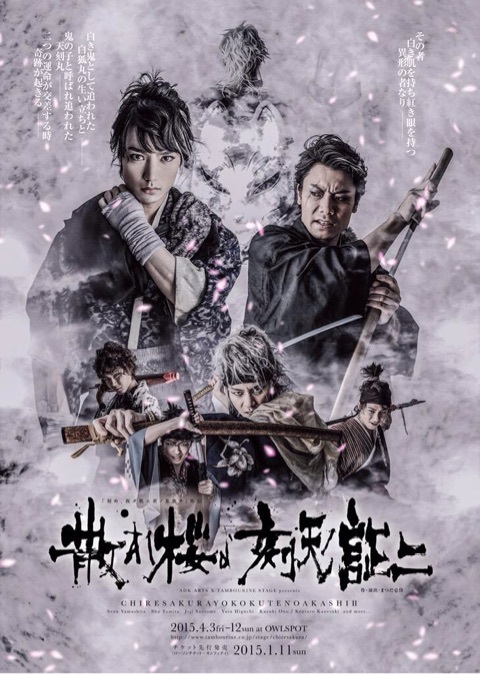 2015年4月3日(金) 「散れ桜よ、刻天ノ証ニ」 【日時】2015年4月3日(金)~4月12日(日) 【場所】あうるすぽっと@池袋 【出演者】 山下翔央 / 富田翔 / 高崎翔太 / 平松可奈子 / 清水一希 / 早乙女じょうじ / 樋口裕太 / 梅田悠 / 小野一貴 / 寺山武志 / 小池美由 / 二階堂隼人 / 北園涼 / 秋葉友佑 / 中島大地 / 鵜飼主水 / わたなべいつき / 伊藤真 / 久米亮平 / ヒロヤ / 成瀬隆典 / 荒木健太朗 / 兼崎健太郎 / 宮下奏 【チケット】 カンフェティ http://www.confetti-web.com/chiresaku ※チケット購入時は備考欄に「宮下奏扱い」とご記入ください S席 6800円(全席指定・税込・非売品グッズの特典付き) A席 前売5300円 / 当日5800円(全席指定・税込) 公式ホームページ http://www.tambourine.co.jp/stage/chiresakura/ |