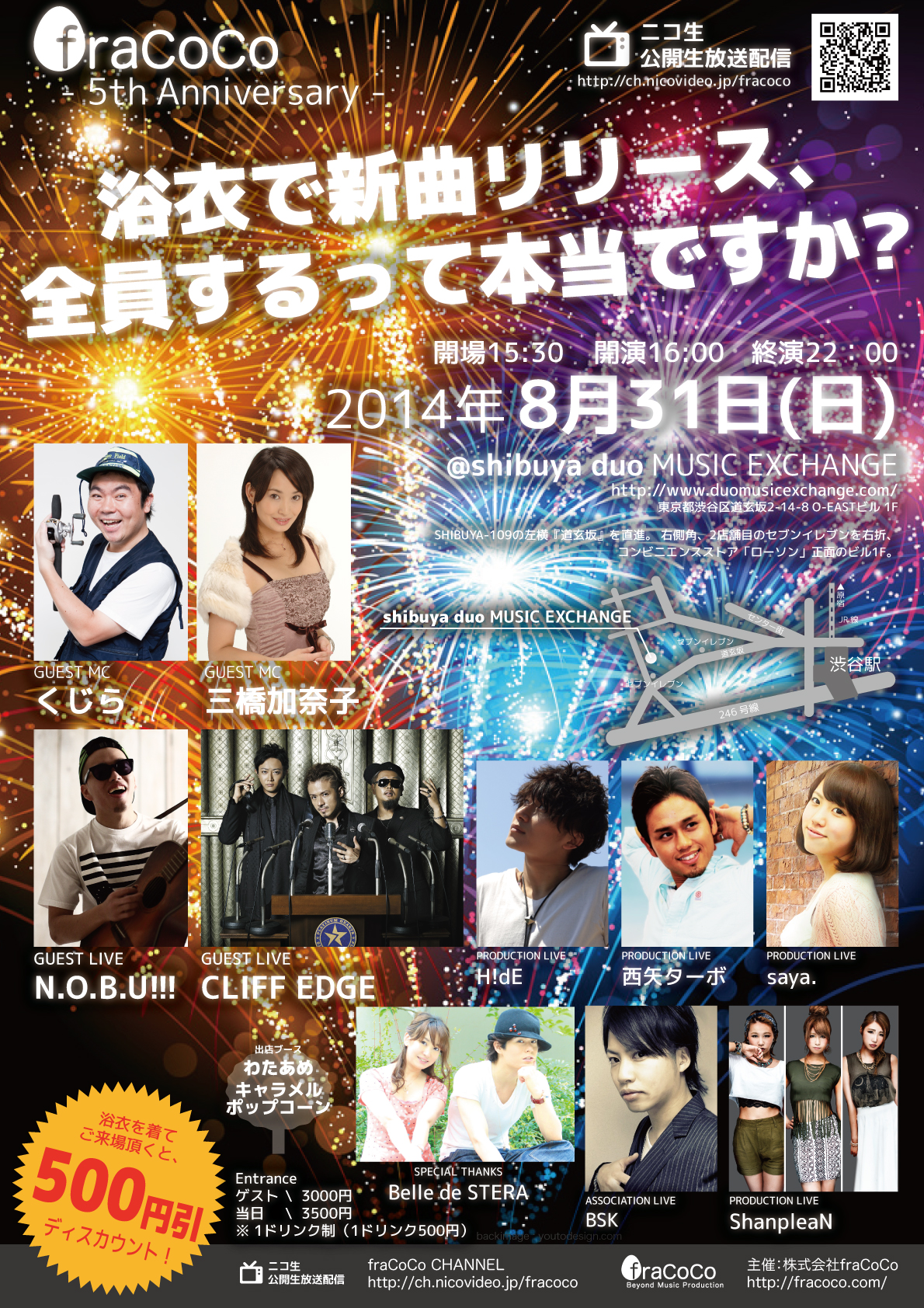 2014年8月31日(日) 【パーティー】 『fraCoCo 5th Anniversary』 【会場】 shibuya duo MUSIC EXCHANGE 【時間】 OPEN 15:30 START 16:00 【料金】 ゲスト 3000円(drink代別途) 当日 3500円(drink代別途) 【出演者】 MC くじら 三橋加奈子 アーティスト N.O.B.U!!! / CLIFF EDGE / H!dE / 西矢ターボ / saya. / Belle de STERA / BSK / ShanpleaN |