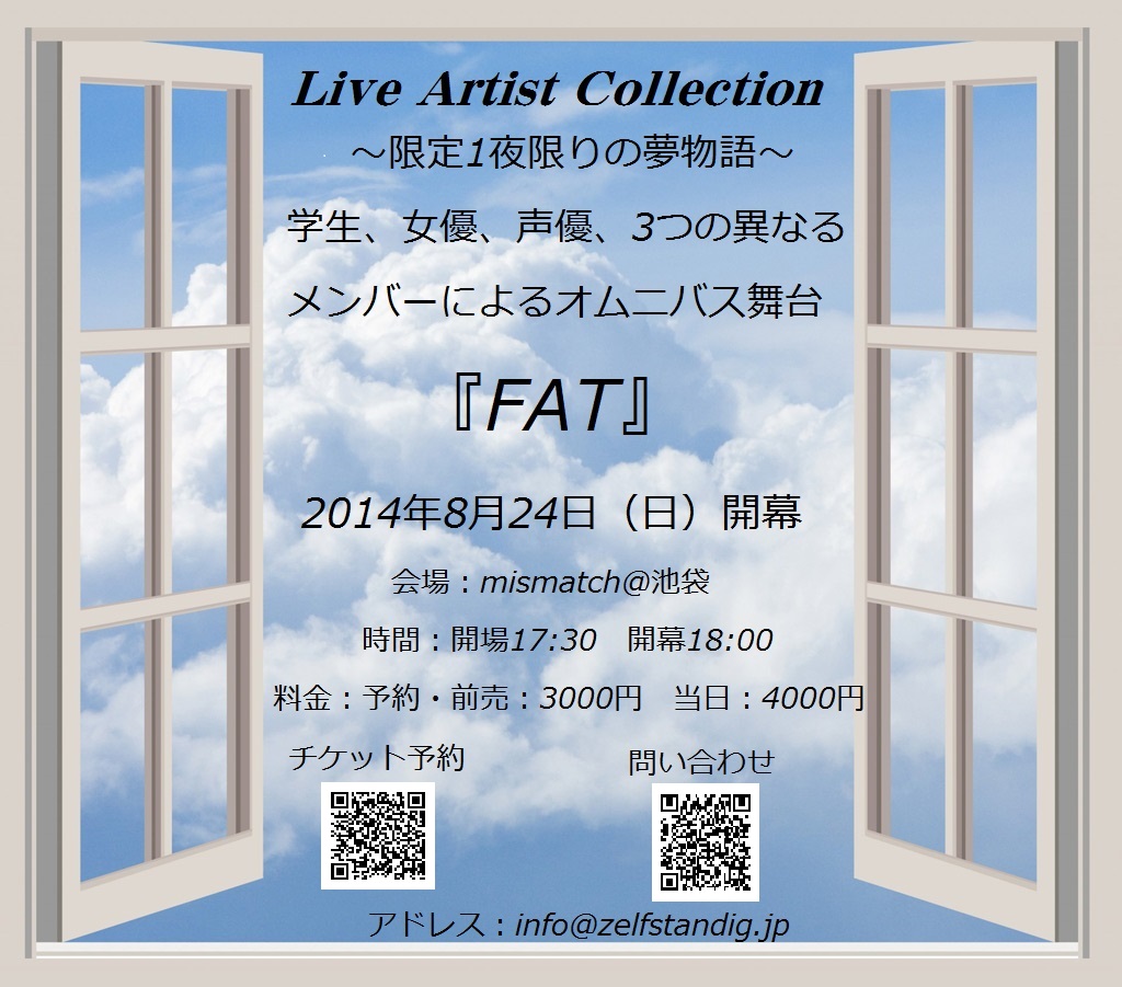 2014年8月24日(日) 【ショート舞台タイトル】 『Live Artist Collection』 ~限定一夜限りの夢物語 オムニバス舞台『FAT』~ 【会場】 mismatch@池袋 【時間】 OPEN 17:30 START 18:00 CLOSE 21:30 【料金】 予約・前売 3000円(1drink代込み) 当日 4000円(1drink代込み) 【出演者】 【劇団このは】 斎藤美柚 / 石川日菜 / 波多野雅子 / 筒井波夏 / 永川恵 / 大和田理子 / 藤川美有羽 / 関原菜緒 / 義澤涼加 / 笠井千聖 / 佐藤雅之 【チーム1500mm】 宮下奏 / 菅原沙織 / 山田瑶 / 木村レイ 【East Voice】 青島百合子 / 安城早那 / 華音沙稀 / 竹井菜々 / 結貴 |