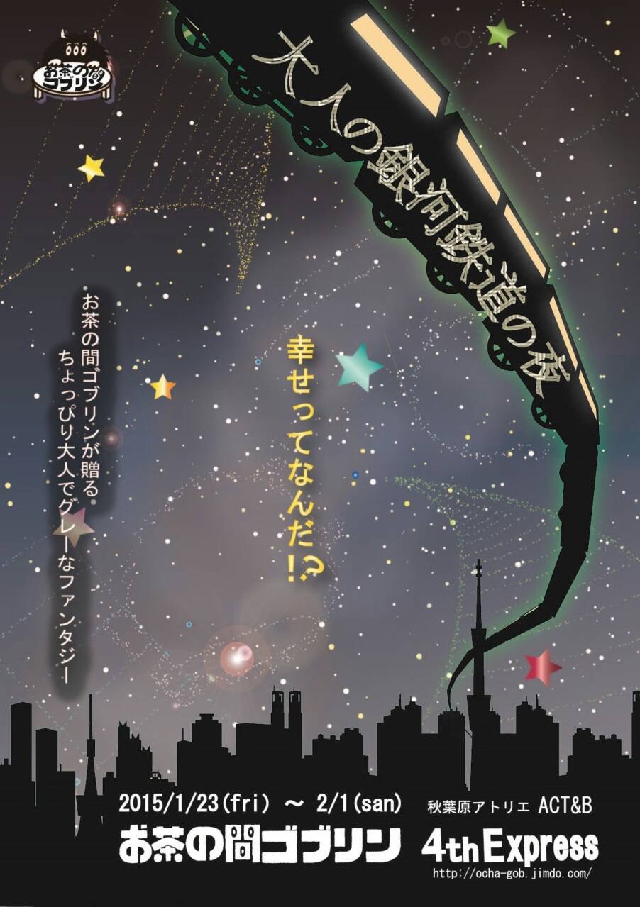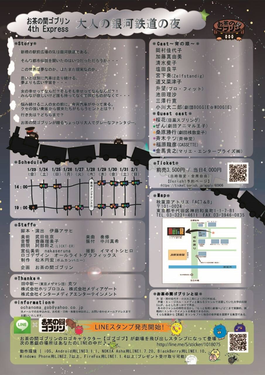 お茶の間ゴブリン 2015年1月23日(金)~2月1日(日) @秋葉原ACT&B ■STORY 新橋の駅前広場のSLは銀河鉄道である。 そんな都市伝説を聞いたのはいつだっただろうか。この世界は夢なのか、はたまた現実なのか。思いとは別に汽車は走り続ける。夢よりも広い宇宙を… 女の幸せってなんだ?そもそも幸せってなんなんだ?!みんなが欲しいけど誰も持ってなくて同じものがなくて… 悩み続ける二人の女の前に、今宵汽車がやって来る。クセの強い乗客から彼女たちがもらうヒントとは?!行き先は?どちらまで? お茶の間ゴブリンが贈るちょっぴり大人でグレーなファンタジー。 ■CAST ~背の順~ 岡村佳代子 / 加藤真由美 / 清水斐子 / 塩田良平 / 宮下奏 (Zelfstandig) / 道又菜津子 / 升望 (プロ・フィット) / 池田理沙 / 三澤行寛 / 小川大二郎 (劇団BOOGIE☆WOOGIE) 【GUEST】 ❤︎桜花 (目黒スプリング) / ♢ぜん (劇団アニマル王子) / ♣︎桑原勝行 (劇団桟敷童子) / ♤斉木テツ (斉伸堂) / ♦︎福原龍彦 (CASSETTE) / ♠︎金馬貴之 (マリエ・エンタープライズ(株)) ■SCHEDULE 2015年1月23日(金)~2月1日(日) 全12回公演 1/23(金)19:00 ♦︎ 1/24(土)14:00♢♣︎♤ 1/25(日)14:00 ♦︎♤♣︎ 1/26(月)19:00♦︎❤︎ 1/27(火)19:00♢♤♣︎❤︎ 1/28(水)車両メンテナンス日 1/29(木)14:00♦︎❤︎♠︎♣︎ 19:00♢❤︎♠︎♣︎ 1/30(金)14:00♢❤︎♠︎♣︎ 19:00♦︎❤︎♠︎♣︎ 1/31(土)14:00♢♠︎♣︎ 19:00♢♠︎♣︎ 2/01(日)14:00♢♠︎♣︎ ※受付開始・開場は、開演の30分前です。※ゲストの出演回につきましては、HPもご参照ください。 http://ocha-gob.jimdo.com/ ■TICKET 前売3,500円 / 当日4,000円 (全席自由・日時指定) Corich!宮下奏専用予約ページ→https://ticket.corich.jp/apply/60906/006/ ■THEATER |