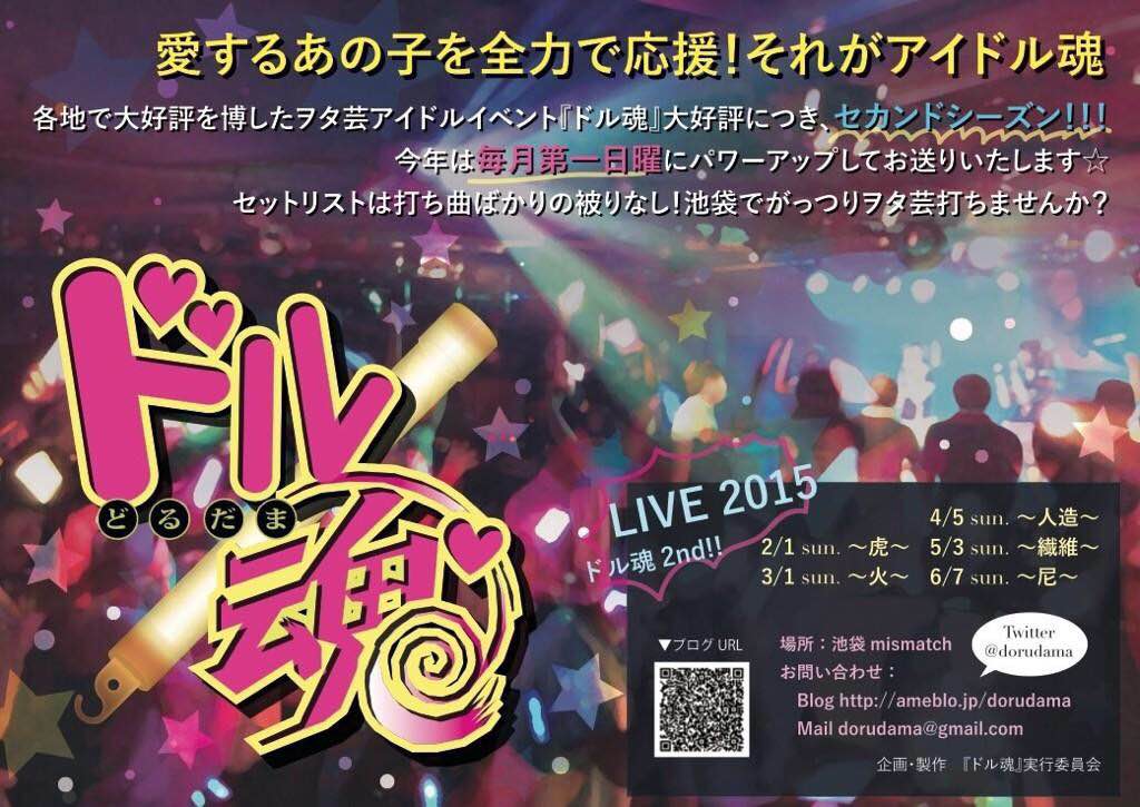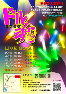 2014年12月14日(日) 【ライヴタイトル】 『ドル魂』~大忘年会!~ 【会場】 mismatch@池袋 【時間】 OPEN 17:00 START 17:30 【料金】 予約・前売 3000円(1drink代別途) 当日 3500円(1drink代別途) 【出演者】 Magical♡Honey / 山崎萌 / 緋咲ねこ / REI / 月乃きら / Lumi*pupu / 白藤美華 / 嘉穂 / 翠条なつ / おるこ / ぱーぷる★まにあ / タンツェンフィーア / 桜咲ちひろ / 吉田満里奈 /And more! |
