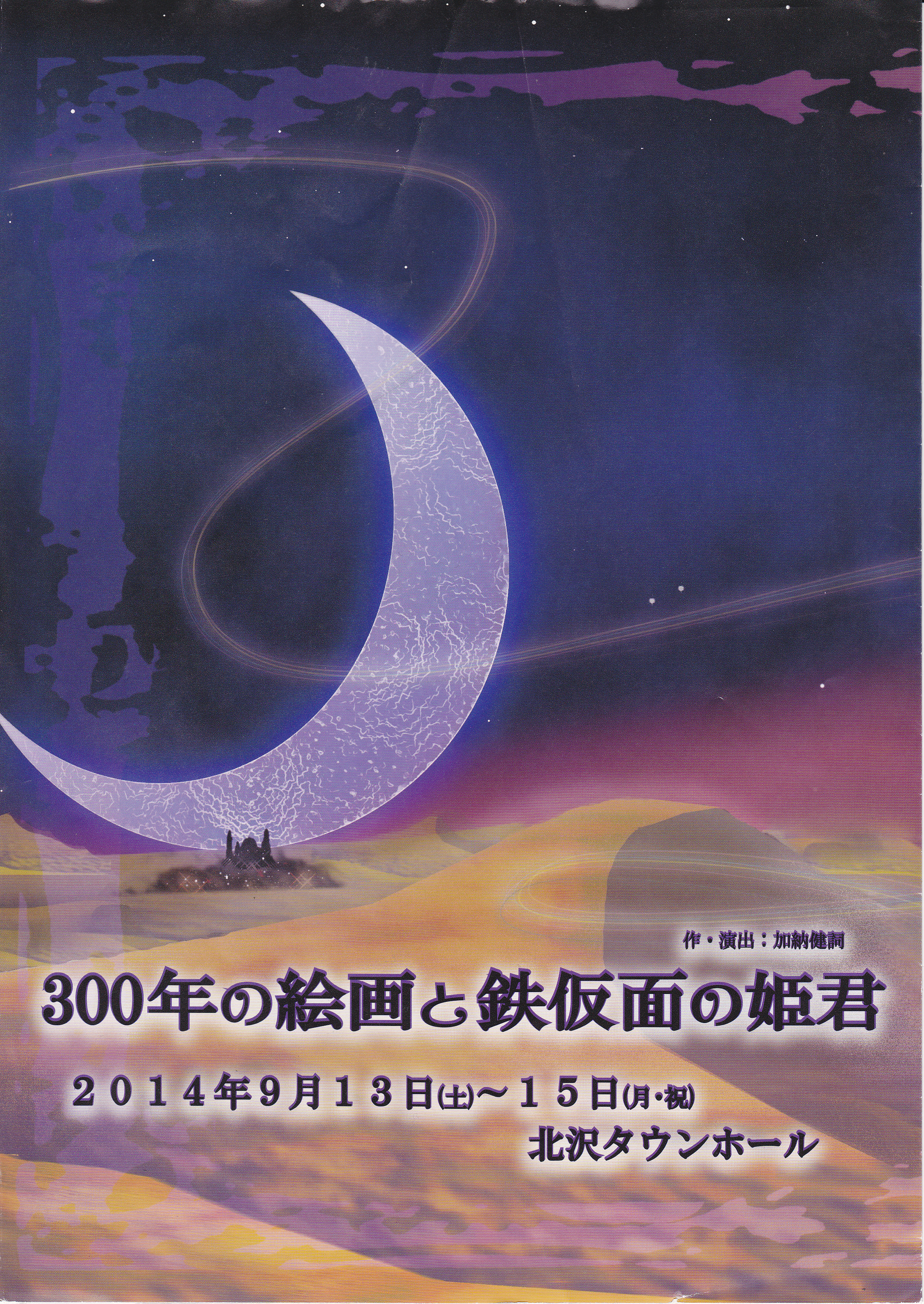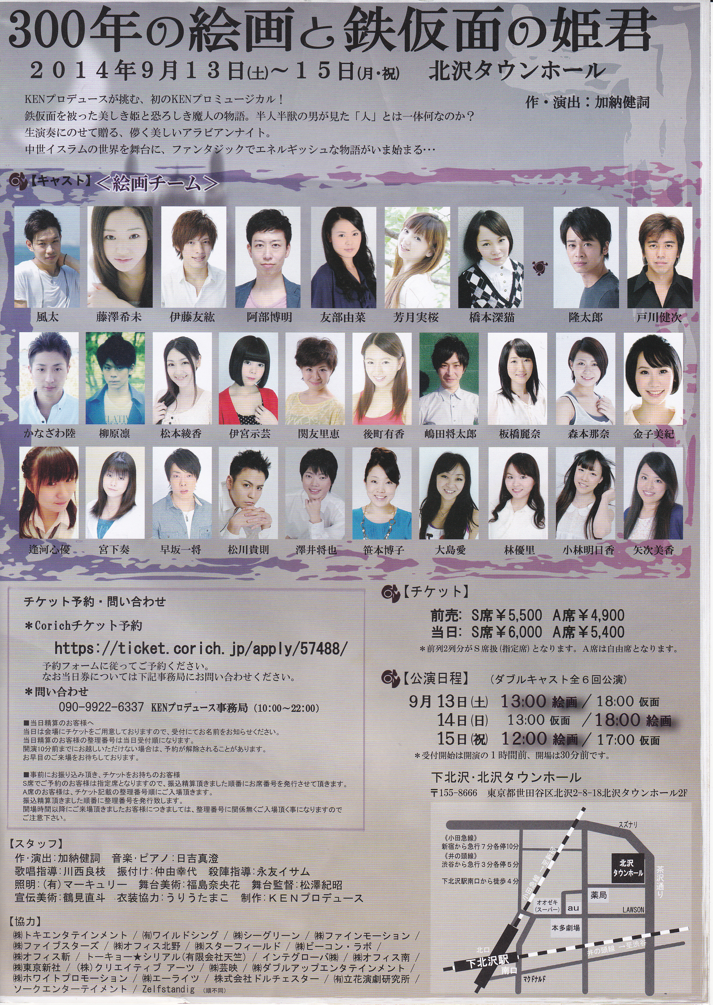 2014年9月13日(土)~15日(月・祝) 【ミュージカル】 『300年の絵画と鉄仮面の姫君』 【会場】 北沢タウンホール 【料金】 前売:S席5500円 A席4900円 当日:S席6000円 A席5400円 【チケット予約】 Corich http://ticket.corich.jp/apply/57488/221/ 【日時】 9/13(土) 13:00(絵画)/18:00(仮面) 9/14(日) 13:00(仮面)/18:00(絵画) 9/15(月・祝)12:00(絵画)/17:00(仮面) 【出演者】 絵画チーム |