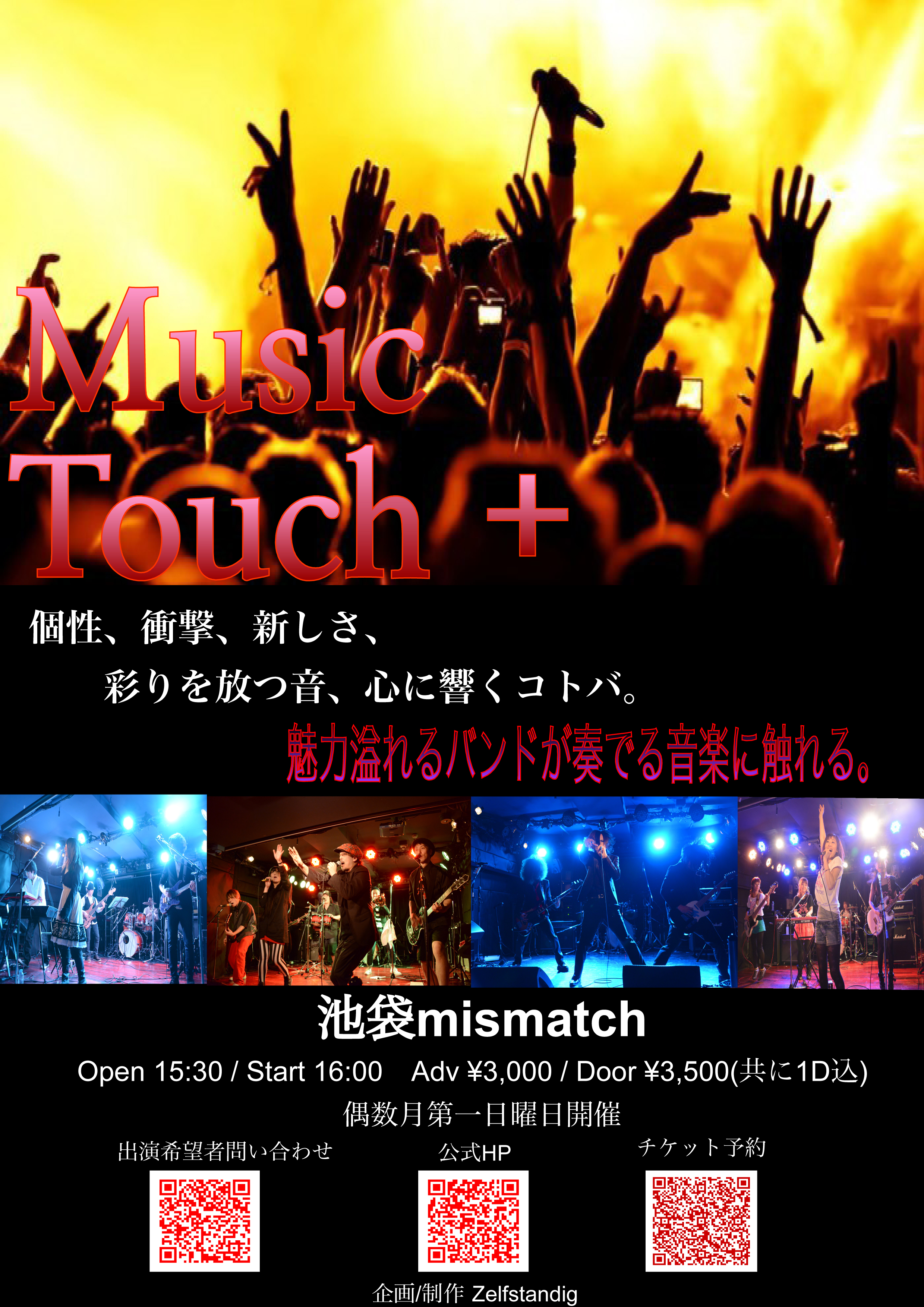 2014年4月6日(日) 【ライヴタイトル】 『Music Touch +』 【会場】 mismatch@池袋 【時間】 OPEN 17:15 START 17:30 CLOSE 21:30 【料金】 予約・前売 2500円(1drink代別途) 当日 3000円(1drink代別途) 【出演者】 Bayasis / NOIZZ / CODE / Alchemy Crystal / ナイトインタテヅカカナガワ |