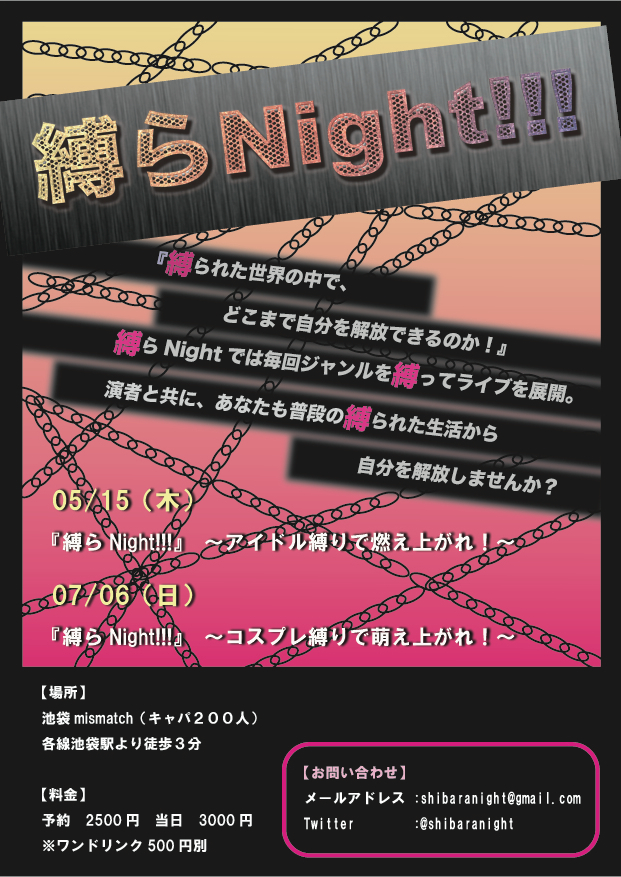 2014年5月15日(木) 【ライヴタイトル】 『縛らNight!!!』 ~アイドル縛りで燃え上がれ!~ 【会場】 mismatch@池袋 【時間】 OPEN 18:30 START 19:00 【料金】 予約・前売 2500円(1drink代別途) 当日 3000円(1drink代別途) 【出演者】 ダイキョウバラカリエス / 嘉穂 / たてみん / うさみはな / 小林玲奈 / かなちょ |
