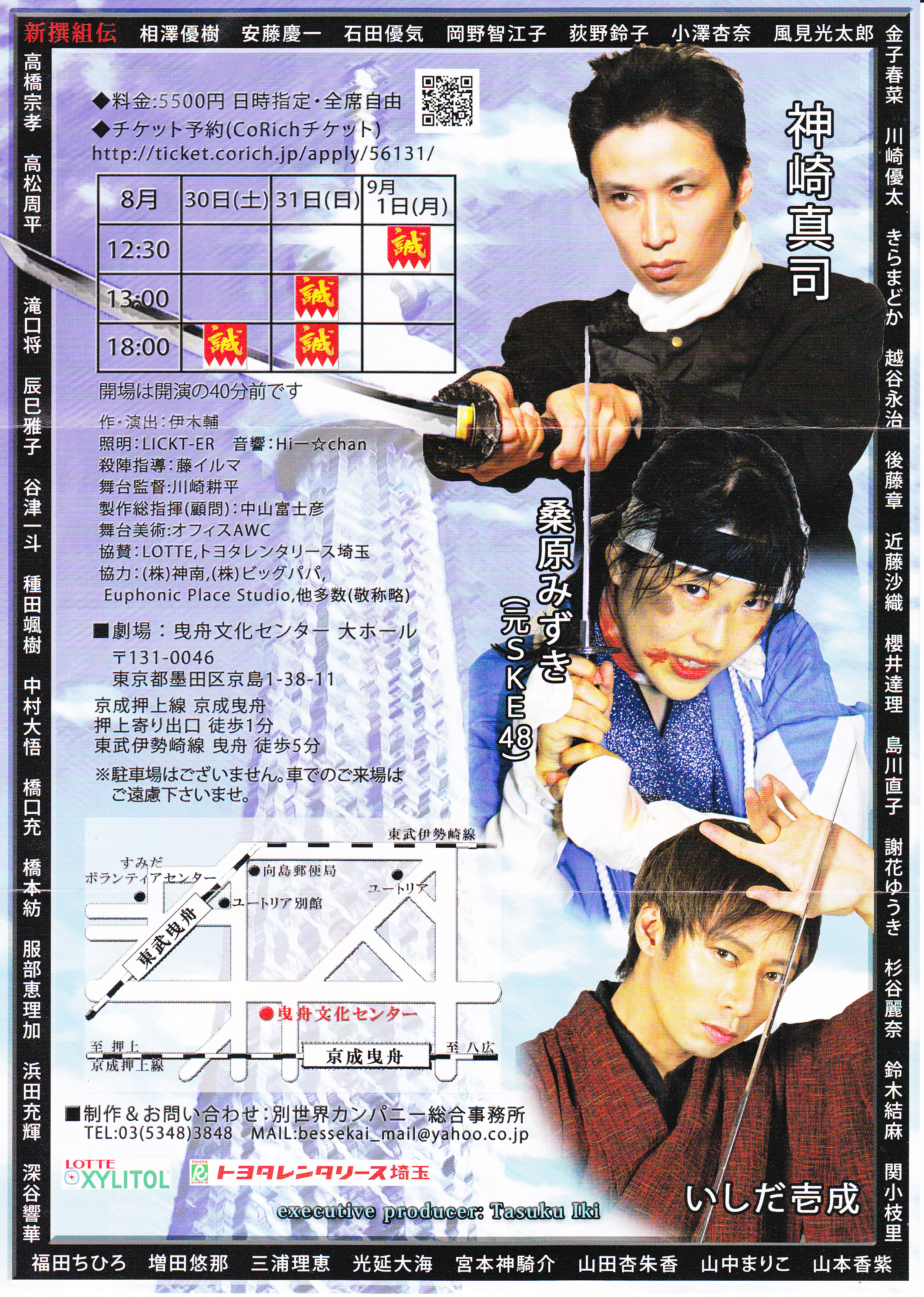 2014年8月30日(土)~9月1日(月) 【舞台】 『新撰組伝』 【会場】 曳舟文化センター大ホール 【料金】 5500円 ※日時指定・全席自由 【チケット予約】 CoRichチケット http://ticket.corich.jp/apply/56131/ 【日時】 8/30(土) 18:00 8/31(日) 13:00、18:00 9/1(月) 12:30 【出演者】 神崎真司 / 桑原みずき(元SKE48) / いしだ壱成 / 他 【制作】 別世界カンパニー |