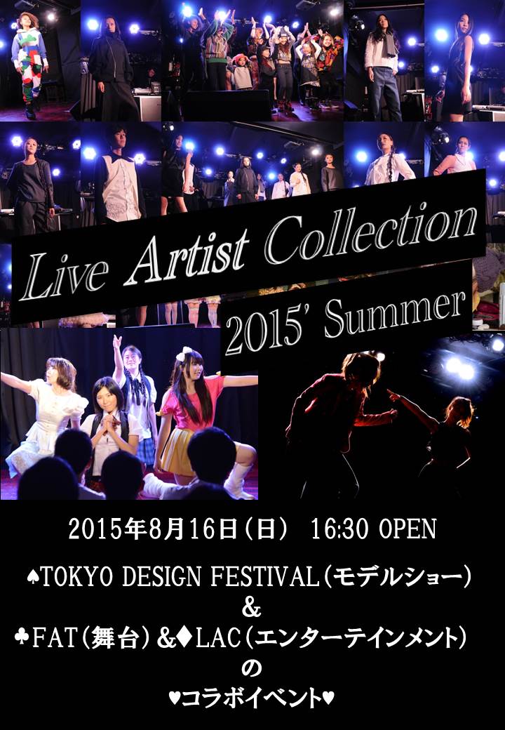 2015年8月16日(日) 【イベントタイトル】 『Live Artist Collection』 ~夏の大交流会2015’~ ~「TOKYO DESIGN FESTIVAL」(モデルショー)&「FAT」(舞台)&「LAC」(エンターテインメント)のコラボイベント~ 【会場】 mismatch@池袋 【時間】 OPEN 16:30 START 17:00 CLOSE 21:30 【入場料】 予約・前売 3000円(1drink代込み) 当日 4000円(1drink代込み) 【入場予約】 Zelfチケット 【DJ】 DJ Kasumi 【モデルショー出演者】 川口はるの / はじめ / 江添まどか / 伊藤友里子 / 高橋いづみ / 菅原さゆり / 鈴木るな / And more 【舞台】 Dias Choir / かなぶん 【ダンス】 Black Cat's 【ライヴ】 華音沙稀 / 歌妖怪やじろべえ 【朗読】 華音沙稀&結貴 / 青島百合子&高崎ゆづる 【総合MC】 歌妖怪やじろべえ |