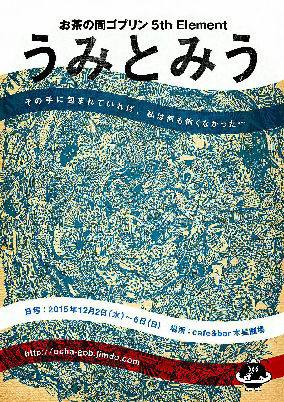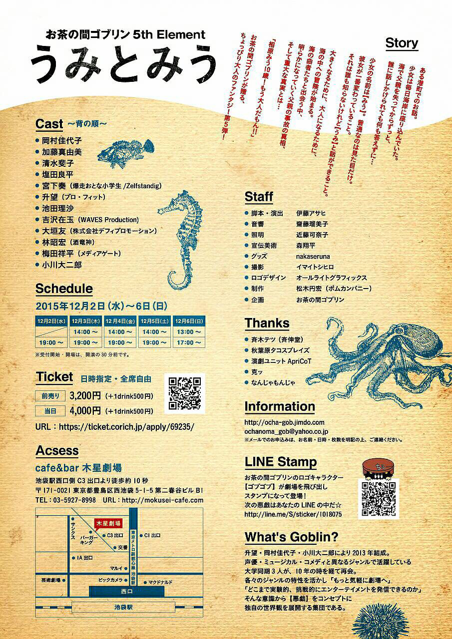 2015年12月2日~6日 【舞台】 お茶の間ゴブリン5th Element 「うみとみう」 その手に包まれていれば、私は何も怖くなかった… 【会場】 cafe&bar 木星劇場 【時間】 12/2(水)19:00 12/3(木)14:00 / 19:00 12/4(金)14:00 / 19:00 12/5(土)14:00 / 19:00 12/6(日)13:00 / 17:00 ※受付開始・開場は、開演の30分前です。 【料金】 前売 3,200円(+1drink 500円) 当日 4,000円(+1drink 500円) 日時指定・全席自由 ※ご予約はコチラ↓ 『宮下奏』専用予約フォーム 【出演者】 ~背の順~ 岡村佳代子 清水斐子 塩田良平 升望 (プロ・フィット) 奥原ひとみ 吉沢在玉 (WAVES Production) 大垣友 (株式会社デフィプロモーション) 林昭宏 (酒竜神) 梅田祥平 (メディアゲート) 小川大二郎 宮下奏 (爆走おとな小学生/Zelfstandig) |