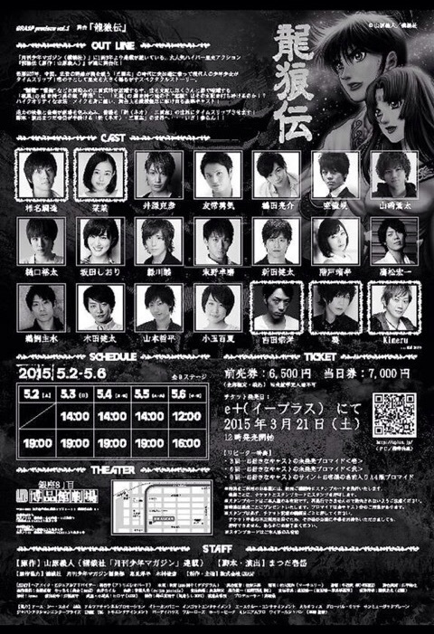 2015年5月2日(土) 講談社「月刊少年マガジン」連載の『龍狼伝』を舞台化! 話題作に『宮下奏』が出演! 【舞台】 『龍狼伝』 【劇場】 博品館劇場 (東京都中央区銀座8-8-11) 【期間】 5月2日(土)~5月6日(水・祝) 【原作】 山原義人(講談社「月刊少年マガジン」連載) 【脚本・演出】 まつだ壱岱 【出演者配役】 天地志狼…椎名鯛造 泉真澄…栞菜 諸葛亮…井深克彦 張飛…友常勇気 趙雲…鶴田亮介 曹操…室龍規 仲達…山碕薫太 伍真…樋口裕太 蓮花…坂田しおり 劉備…緑川睦 関羽…末野卓磨 許褚…新田健太 月英…階戸瑠李 虚空…鷹松宏一 夏侯惇…鵜飼主水 荀彧…木田健太 単福…山本哲平 愛琳…小玉百夏 曹仁…吉田宗洋 佐慈…葵 大幻…Kimeru アンサンブル… 田中翔大 / 成瀬隆典 / 竹本凌 / 田嶋悠理 / 小林聖尚 / Ayano / 松岡美那 / 宮下奏 【ホームページ】 http://assh.info/ryurouden/ 【チケット予約】 http://assh.info/ryurouden/ticket.html 【料金】 前売:6500円 当日:7000円 ※全席指定、税込 ※未就学児入場不可 【製作・主催】 株式会社 GRASP |