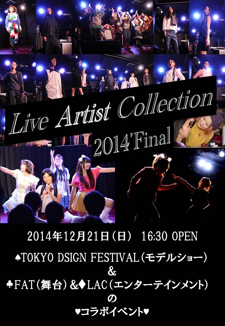 2015'最後の交流会スペシャル!!! 「モデル」「歌手」「役者」「ダンサー」「声優」たちが入り乱れてのプロモーションイベント。 芸能プロダクションやメジャーレーベルの代表取締役や部長クラスの方々をはじめ、雑誌の編集長やライターの方々、各方面のプロデューサーや映画や アニメの監督、弁護士や医者、スポー ツ選手や会社社長たちも毎回来場の交流会イベント。 今年からは業界関係者のみのコラボイベントになりますので気軽に名刺交換、自己アピールをして来年以降に繋げてください。 お仕事依頼、タレントのアピール、スポンサー探し、人脈拡大など目的はいろいろで結構。 今年1年携わった方たちに感謝し、様々なアーティストのパフォーマンスを見ながらジャンルを超えたコミュニケーションを楽しみましょう! 会場内には無料にて駄菓子や軽食もご用意致しております。毎回うまい棒が全種類揃っているイベントはここだけ?(笑) バーカウンターでも、たこ焼き、唐揚げ、えだまめ【わさび味】を販売! 是非、ご友人・仕事仲間・取引先・タレントをお誘いあわせのうえ遊びにお越し下さい。 ☆タイトル☆ 『Live Artist Collection~年末大交流会2015'!!!~』 ~モデルショー&舞台&ライヴ&朗読~ ~「TOKYO DESIGN FESTIVAL」&「FAT」&「LAC」コラボイベント~ ☆日程☆ 12月20日(日) ☆会場☆ mismatch@池袋ライヴハウス ☆時間☆ 開場 16:30 開演 17:00 物販&交流会 20:00 ☆入場料☆ 予約・前売・当日 2000円(1drink代、軽食代込み) ☆入場予約☆ Zelfチケット ☆備考☆ ご来場の際には名刺をご持参ください ※名刺が無くてもご入場は可能です ☆DJ☆ DJ Kasumi(若干20歳の女性モデルDJ) ☆モデルショー出演者☆ 川口はるの / 鈴木るな / 澤田加奈子 / 坂田柚希 / 蓮ゆい / 奥田さつき / 和田晶子 / HiRoe / 松谷鷹也 / And more ☆ショート舞台☆ かなぶん ☆ライヴ☆ REI /All or Nothing / 茉嶋みらい / 岩永愛花 / 歌妖怪やじろべえ / And more ☆朗読&朗読劇☆ NYA / 稲垣昂志 / 華音沙稀 / 遥風 ☆総合MC☆ 歌妖怪やじろべえ |