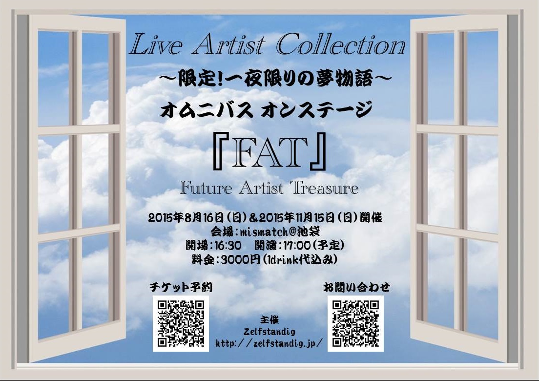 夏休み特別バージョン!!! 夏休みも終わりに近づく8月最終日曜日! 学生、女優、声優、 3つの異なるメンバーによるオムニバス舞台『FAT』を開催!!! ステージに立って役を演じる 自分で作った脚本が披露される 現役学生、女優、声優たちの夏の結晶となる舞台! 一夏を締めくくる思い出に、 家族・友人・大切な人と一緒に観劇ください♡ ☆タイトル☆ Live Artist Collection ~限定一夜限りの夢物語 オムニバス舞台『FAT』~ ☆日程☆ 8月24日(日) ☆会場☆ mismatch@池袋 ☆時間☆ OPEN 17:30 START 18:00 交流会・物販 21:00 CLOSE 21:30 ☆料金☆ 予約・前売 3000円 当日 4000円 ※1drink代込み ☆出演者 【劇団このは】 斎藤美柚 / 石川日菜 / 波多野雅子 / 筒井波夏 / 永川恵 / 大和田理子 / 藤川美有羽 / 関原菜緒 / 義澤涼加 / 笠井千聖 / 佐藤雅之 【チーム1500mm】 宮下奏 / 菅原沙織 / 山田瑶 / 木村レイ 【East Voice】 青島百合子 / 安城早那 / 華音沙稀 / 竹井菜々 / 結貴 |